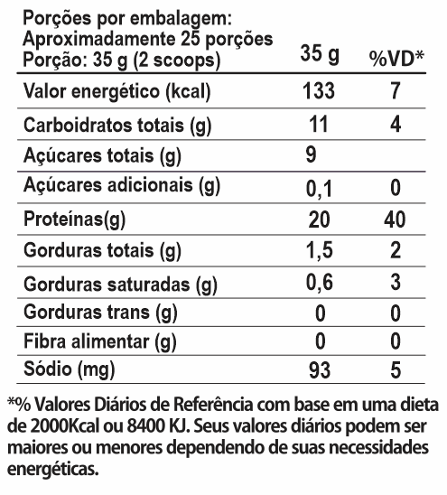 Ingredientes: Proteína concentrada do soro do leite (Whey Protein), aroma artificial idêntico ao natural de baunilha, edulcorantes acessulfame de potássio e sucralose.